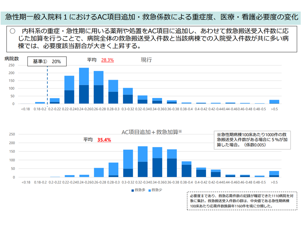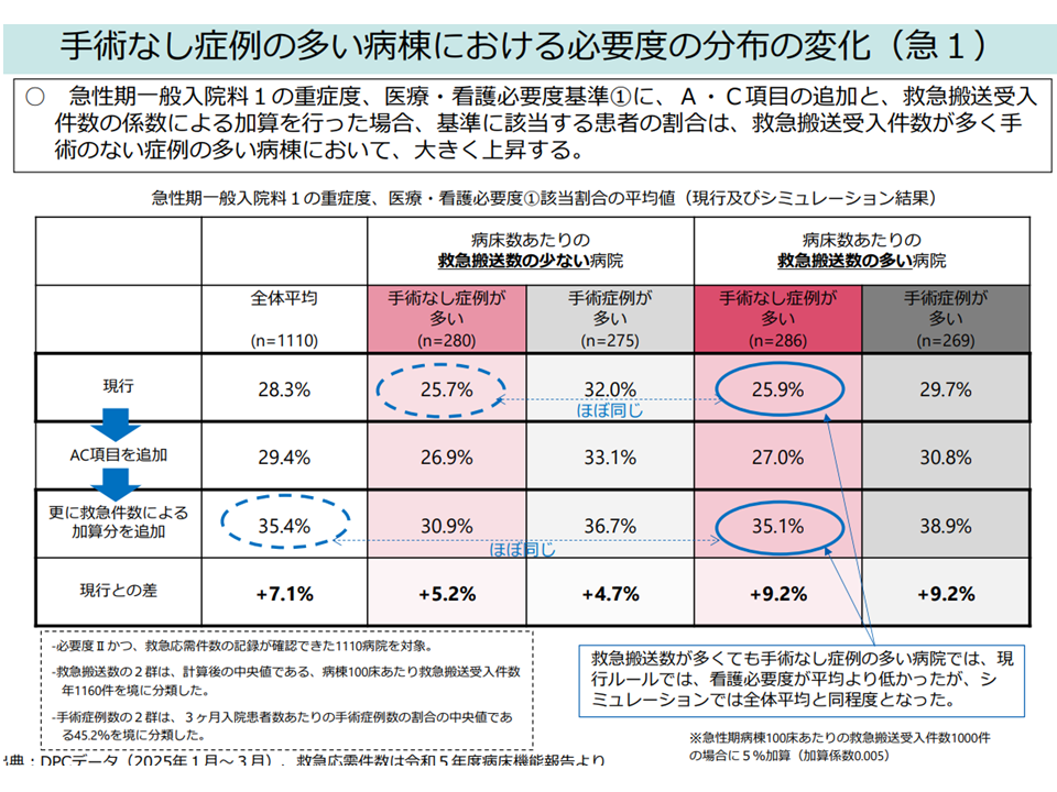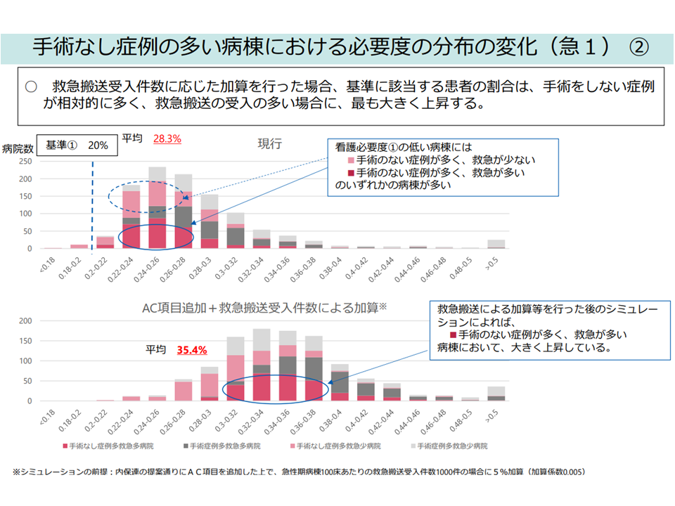 一般病棟用の重症度、医療・看護必要度について「内科症例が不利になっている」との指摘を踏まえ、A・C項目への内科的処置の追加や、救急搬送患者の受け入れ状況などを踏まえた加算を行ってはどうか。これにより「救急搬送受け入れが多く、手術なし症例が多い」病棟において、看護必要度底上げの大きな効果が得られる―。