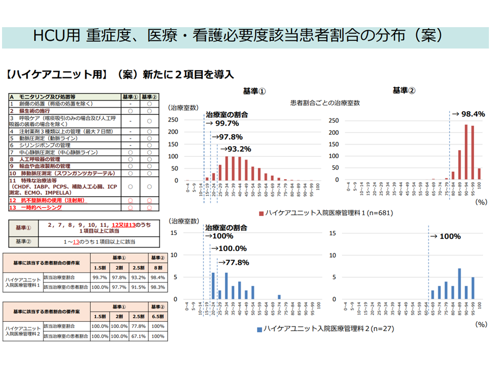 また林医療課長は、特定集中治療室用の看護必要度(以下、ICU看護必要度)やハイケアユニット用の看護必要度(HCU看護必要度)について、これまでの議論を踏まえた「項目の追加」案を提示しました。