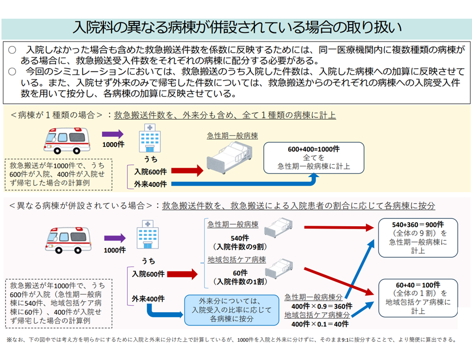 →入院せず外来のみで帰宅した件数は「救急搬送からのそれぞれの病棟への入院受入件 数を用いて按分し、各病棟の加算」に反映