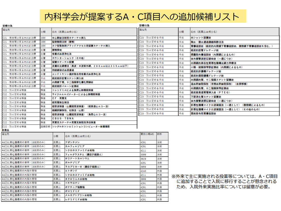まず、(1)のA項目(モニタリング・処置)・C(手術)への追加については、内科系学会社会保険連合(内保連、142の内科系学会で構成される組織)の提案をもとにしています。
