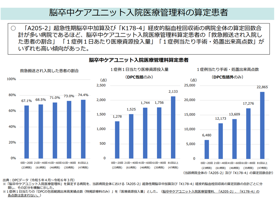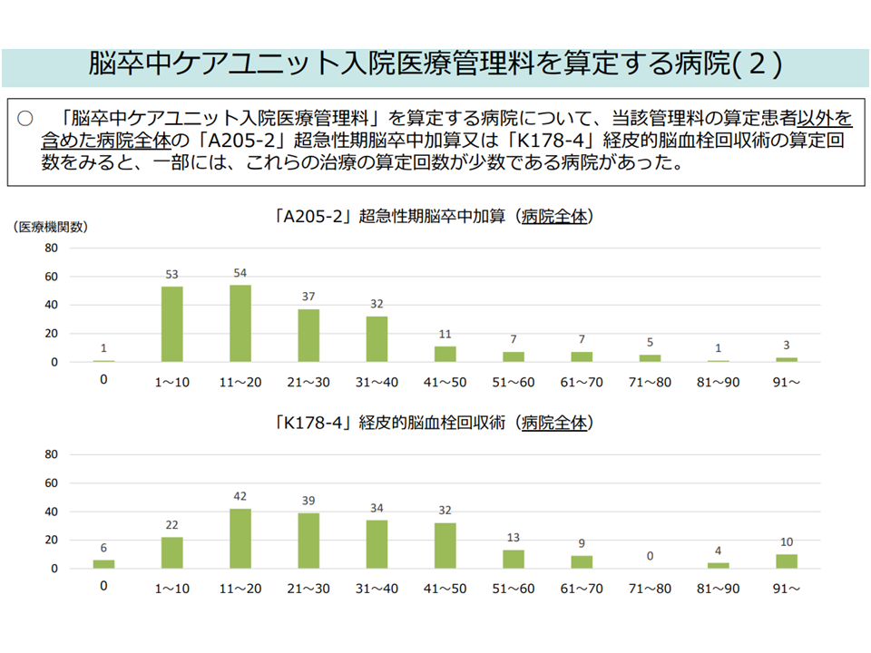 さらに脳卒中ケアユニット(SCU)の中には、血栓の溶解術・回収術をほとんど行っていない病院・ユニットもあり、施設基準で「血栓の溶解術・回収術」実施にかかる一定の実績基準を設けてはどうか―。