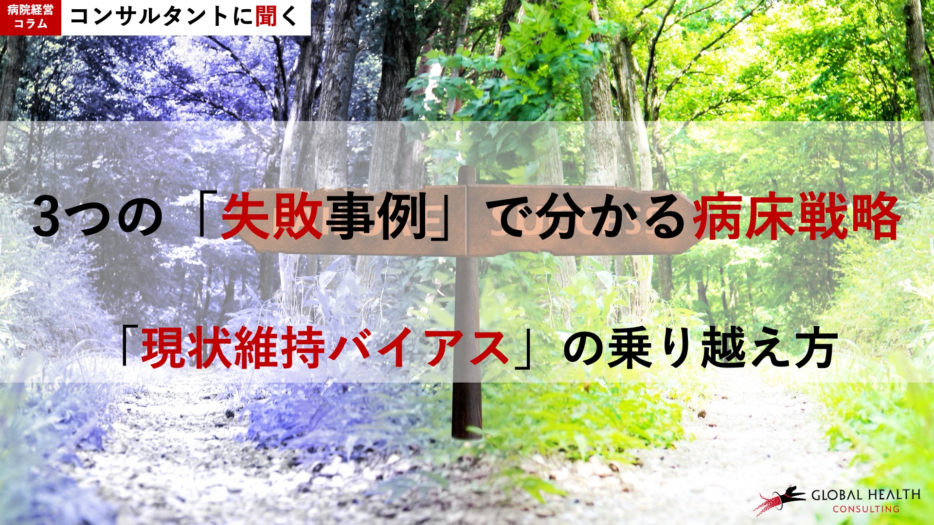 7割の病院が赤字という厳しい経営環境が続いています。一方、超高齢社会での労働力不足や財政悪化が懸念される「2040年問題」への対応も待ったなしです。日本の社会全体が大きく変化しつつある中、提供する医療とその対象患者を5~10年スパンで見直す「病床戦略」が多くの病院で検討されています。ただ、「失敗事例」も散見されます。なぜ、失敗したのか――。失敗事例の裏には、成功のヒントも隠されています。失敗事例の根底にある変化を恐れる「現状維持バイアス」の乗り越え方について、3つの事例を通じて理解します(本記事はGHC主催ミニウェビナー「病床機能分化の成功の鍵とは ~戦略的に検討して成果につなげよう~」の内容から一部抜粋して構成されています)。