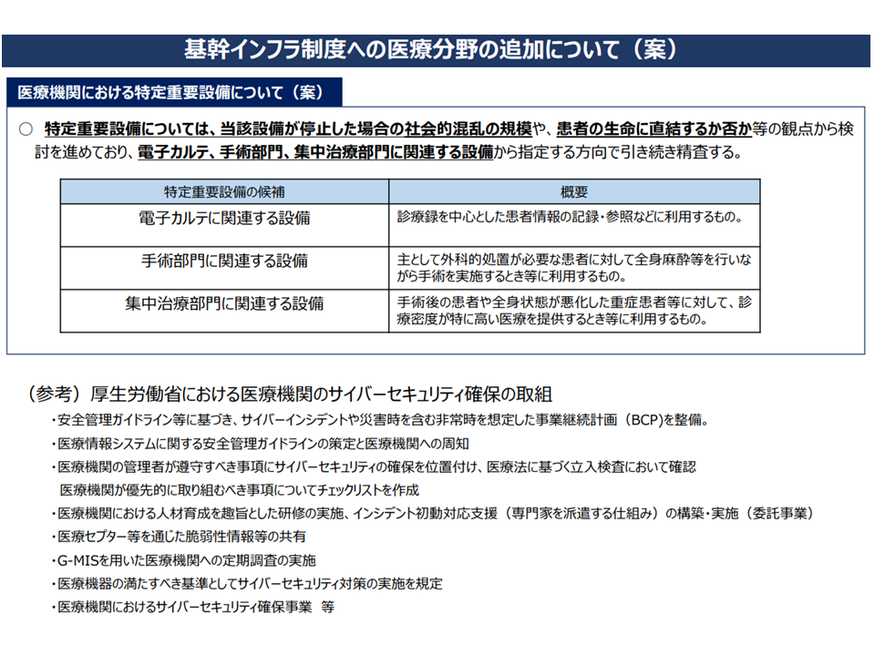 また、国が「基幹インフラ事業と事業者」を指定し、重要設備の導入・維持管理等の委託をしようとする際には、「事前に国に届け出を行い、審査を受ける」制度が2024年5月から始まっている(重要設備に言わば「サイバー時限爆弾」が仕掛けられていないかなどのチェックを行う)。医療分野もこの制度の対象とすることが検討されており、まず「特定機能病院」の一部を事業者に指定することとしてはどうか―。