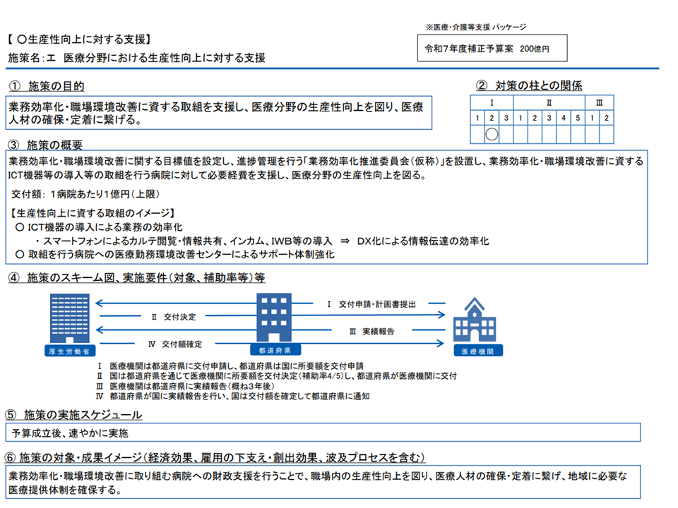 →業務効率化・職場環境改善に関する目標値を設定し、進捗管理を行う「業務効率化推進委員会(仮称)」を設置し、業務効率化・職場環境改善に資するICT機器等の導入等を行う病院に対して必要経費を支援し、医療分野の生産性向上を図る