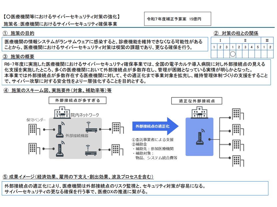 →全国の電子カルテ導入病院に対し外部接続点の見える化支援を実施したところ、多くの医療機関において外部接続点が多数存在し、管理が困難となっている実情が明らかとなったことを踏まえ、外部接続点が多数存在する医療機関に対して、その適正化まで事業対象を拡充し、維持管理体制づくりの支援をすることでサイバー攻撃に対する安全性をより一層強化することを目的とする(関連記事はこちら)