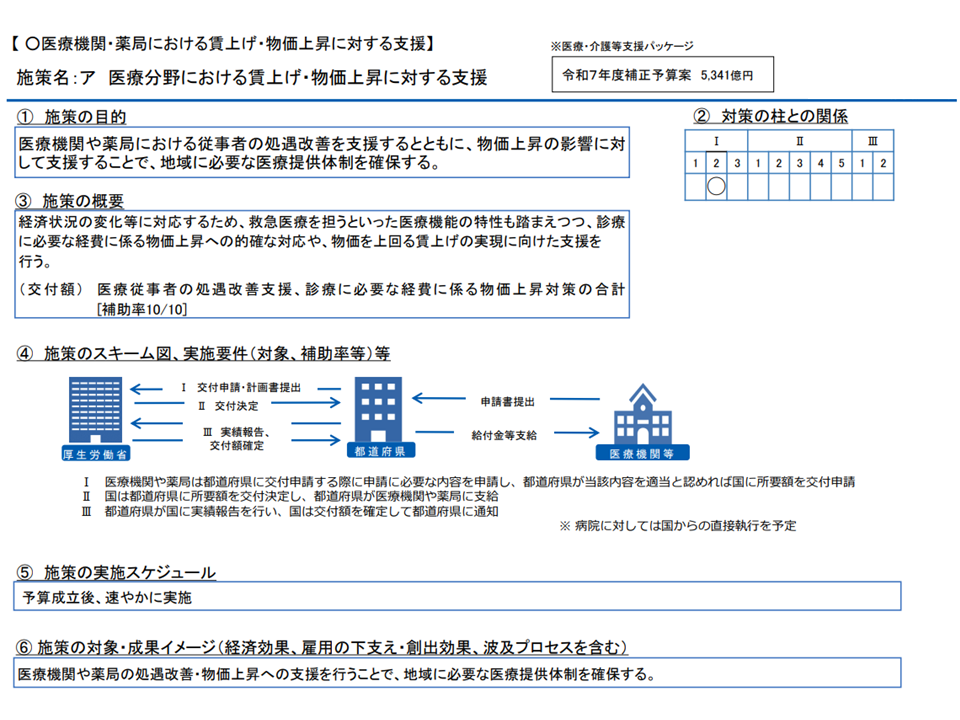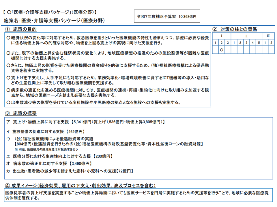 「医療・介護等支援パッケージ」は、高市内閣が先に閣議決定した「『強い経済』を実現する総合経済対策」を踏まえたもので、▼医療・介護分野における賃上げ・物価上昇に対する支援(5341億円、うち賃上げ1536億円、物価上昇3805億円)▼施設整備の促進に対する支援(462億円)▼福祉医療機構による優遇融資等の実施(804億円、優遇融資を行うための福祉医療機構の財政基盤安定化等・資本性劣後ローンの融資財源、別途、優遇融資の融資財源は財投要求を行う )▼医療分野における生産性向上に対する支援(200億円)▼病床数の適正化に対する支援(3490億円)▼出生数・患者数の減少等を踏まえた産科・小児科への支援(72億円)—などが柱の施策となります。