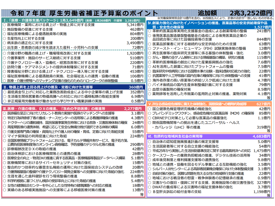 高市早苗内閣が11月28日に2025年度補正予算案を閣議決定しました。厚生労働、とりわけ医療・介護分野では、▼「医療・介護等支援パッケージ」1兆3649億円(医療 1兆368億円 介護等 3281億円)▼医療・介護の確保、DXの推進、「攻めの予防医療」の推進等 2277億円▼創薬力強化に向けたイノベーションの推進、医薬品等の安定供給確保や品質・安全性の確保等 1527億円▼次なる感染症危機等に備えた体制強化、国際保健への戦略的取組等627億円—などが盛り込まれています。今臨時国会での早期成立に期待が集まります(厚労省サイトはこちら(ポイント)とこちら(主要施策))。