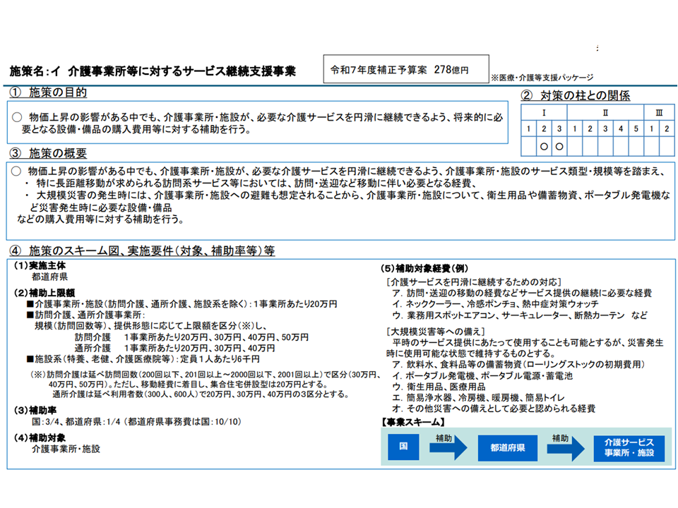 →物価上昇の影響がある中でも、介護事業所・施設が、必要な介護サービスを円滑に継続できるよう介護事業所・施設のサービス類型・規模等を踏まえた補助を行う