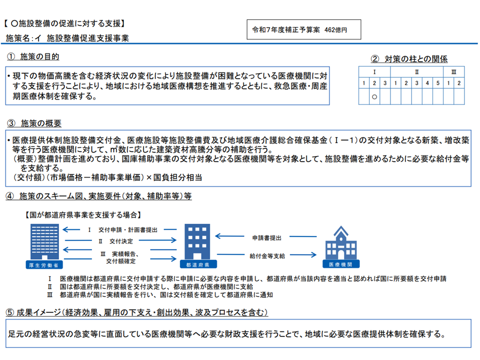 →現下の物価高騰を含む経済状況の変化により施設整備が困難となっている医療機関に対 する支援を行い、地域医療構想の推進、救急医療・周産 期医療体制の確保を図る