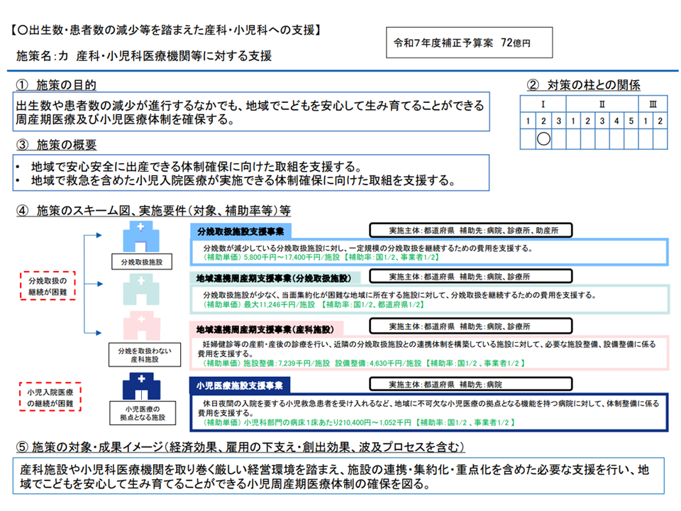 →分娩取扱施設支援事業:分娩数が減少している分娩取扱施設に対し一定規模の分娩取扱を継続するための費用を支援(補助額:1施設あたり580万円-1740万円、補助率は国1/2・事業者1/2)