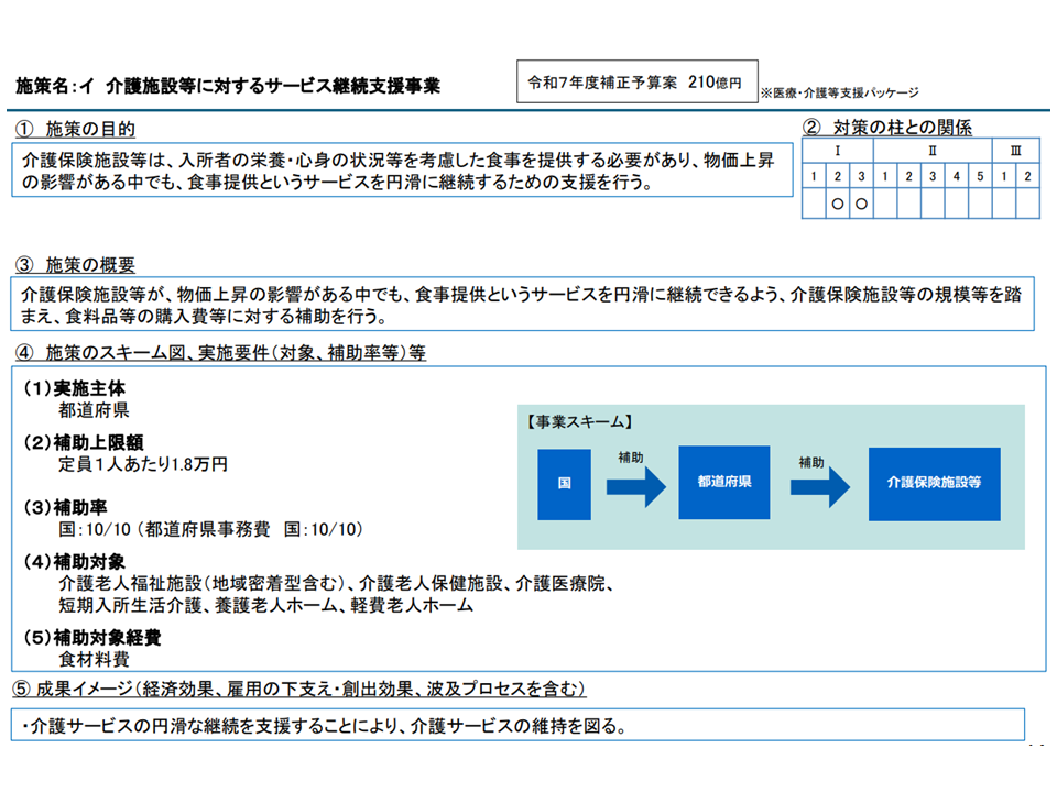 →介護保険施設等が、物価上昇の影響がある中でも、食事提供というサービスを円滑に継続できるよう、介護保険施設等の規模等を踏まえ、食料品等の購入費等に対する補助(定員1人あたり1万8000円)を国10/10で行う