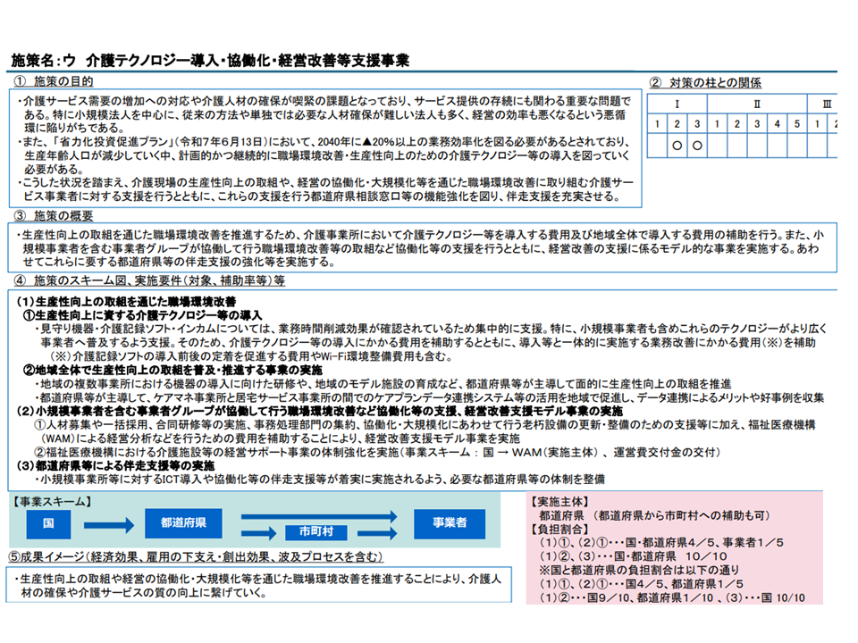 ・生産性向上の取組を通じた職場環境改善(生産性向上に資する介護テクノロジー等の導入、見守り機器・介護記録ソフト・インカムについては業務時間削減効果が確認されているため集中的に支援、とくに小規模事業者も含めこれらのテクノロジーがより広く事業者へ普及するよう支援する。導入等と一体的に実施する業務改善にかかる費用(介護記録ソフトの導入前後の定着を促進する費用やWi-Fi環境整備費用も含む)を補助)