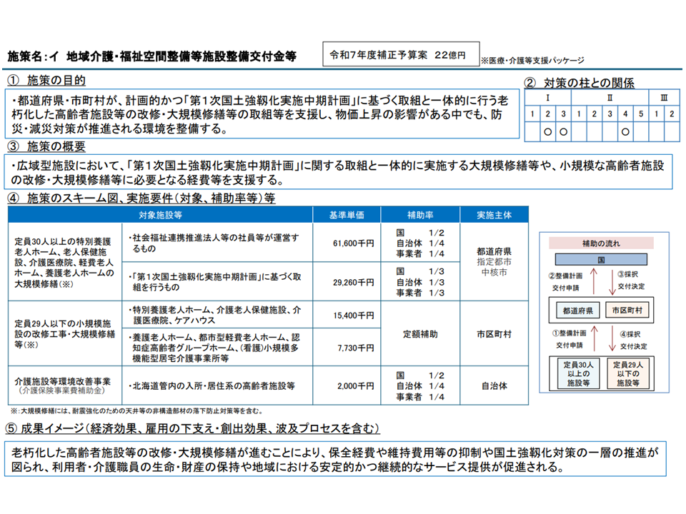 →広域型施設において、「第1次国土強靱化実施中期計画」に関する取り組みと一体的に実施する大規模修繕等や、小規模な高齢者施設の改修・大規模修繕等に必要となる経費等を下表のとおり支援する