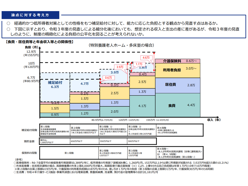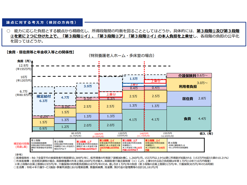 低所得な施設入所者等の居住費などを補填する「補足給付」、利用者の所得区分を細分化