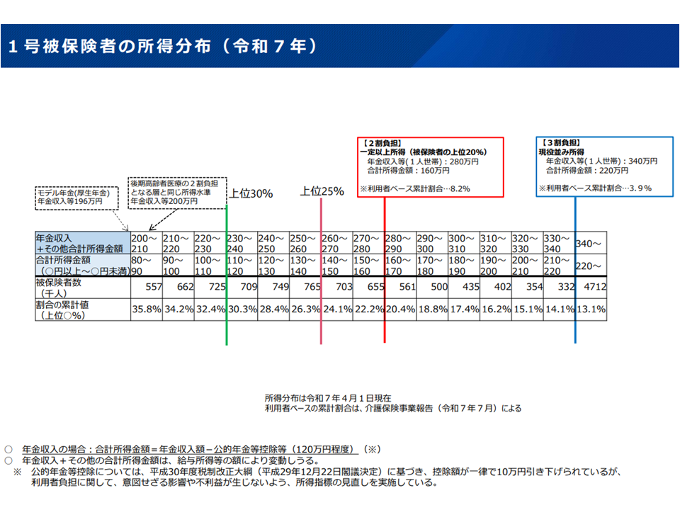 公平な介護サービス利用、介護保険制度の持続可能性確保に向けて、例えば「介護サービス利用時に、通常1割負担であるところ、2割の負担を求める高所得者」を拡大してはどうか。その際、自己負担が急増しないような配慮なども行ってはどうか―。