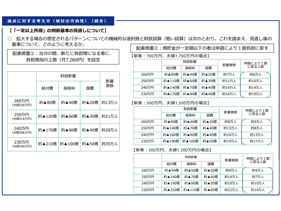 また、配慮措置2については、「1割負担のまま」とする「預貯金の基準額」を低く設定するほど、「1割負担のままとなる者が少なく、2割負担となる者が多くなる」ため、国費(税金)や保険料負担が現在よりも小さくなる効果が大きいと言えます(下表に試算結果を整理)。