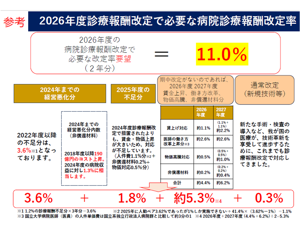 こうした状況の改善に向けて相良会長は「11%の診療報酬プラス改定が2026年度には必要である」と強調します。