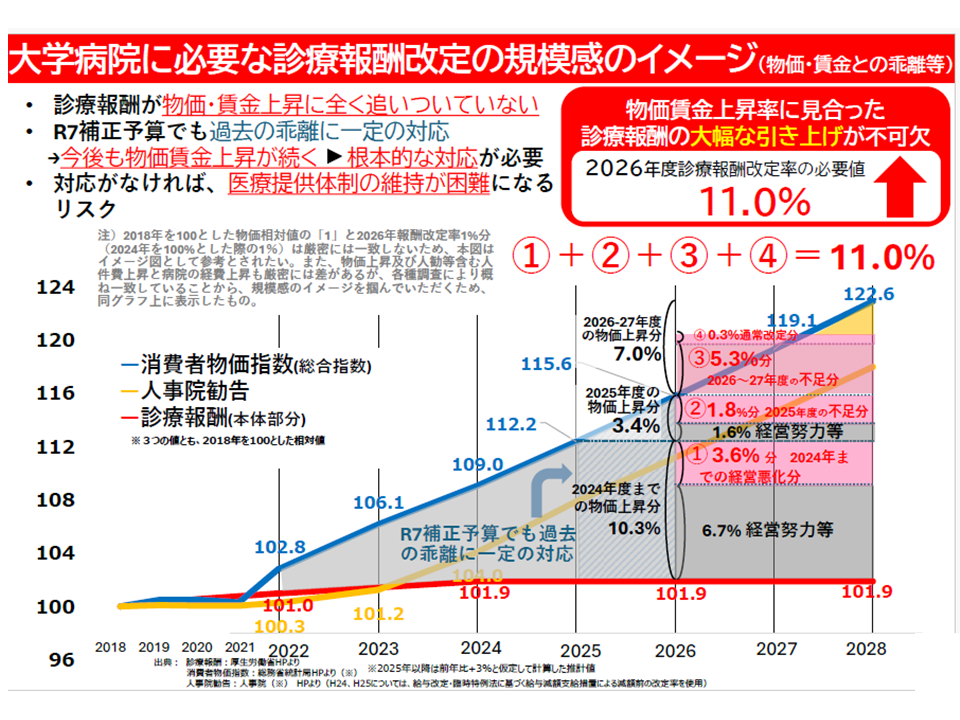 大学病院の経営窮状を打開するため「2026年度には11%の大幅プラス改定」が必要―医学部長病院長会議