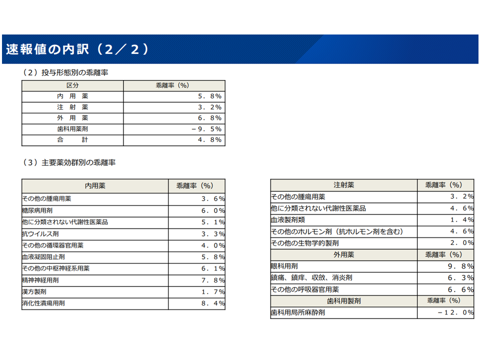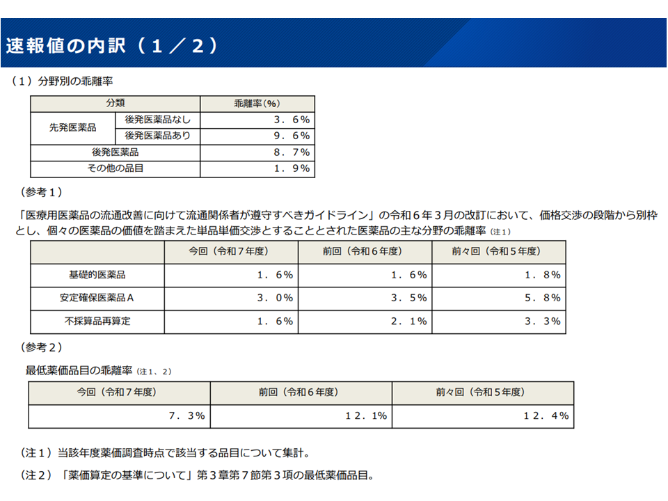 2025年における薬価と市場実勢価格との平均乖離率は全体では約4.8%、同じく材料価格と市場実勢価格との平均乖離率は約1.3%であった―。