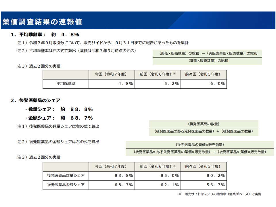 また、後発医薬品の使用割合は、数量ベースでは約88.8%で、2024年度調査(85.0%)に比べて3.4ポイント上昇、金額ベースでは68.7%で、2024年度調査(62.1%)に比べて6.6ポイント上昇しました。数字だけを見ると、「新たな目標値」はクリアできているように見えます。