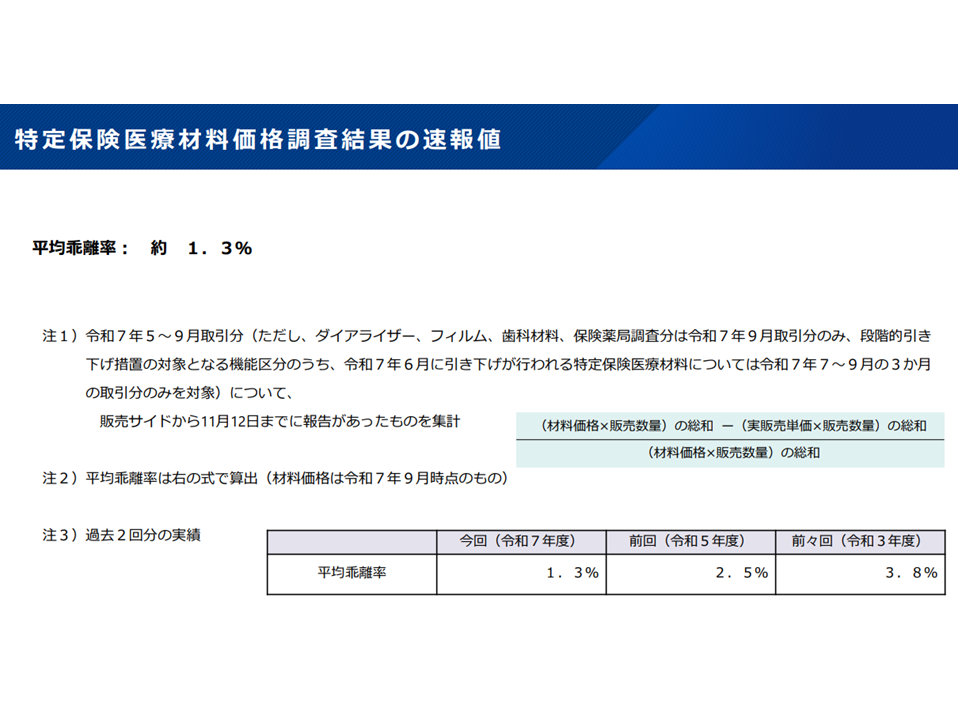 一方、医療材料については、平均乖離率が約1.3%となりました。2019年度調査では5.8%、21年度調査では「3.8%」、23年度調査では「2.5%」でしたので、こちらも「乖離幅が縮小している」ことが分かります。