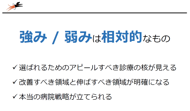 「診療科ヒアリング」を行う上でまず認識してもらいたいのは、「病院の強みや弱みは相対的なものである」ということです。当社が推奨する他病院と比較するベンチマークでは、病院の弱みだけではなく、強みも見えてきます。他病院と比較して分かった「差異」は、病院それぞれの特徴であり、選ばれる病院になるためのヒントが隠されているのです。伸ばすべき領域は伸ばし、改善すべき領域は改善することで、選ばれる病院として目指すべき本当の戦略が見えてきます。