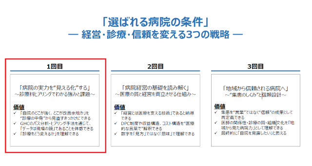 開催したミニウェビナーは、「選ばれる病院の条件」を大テーマに、「経営」「診療」「信頼」を変える3つの戦略を解説します。初回は「経営」を取り上げて、「病院の実⼒を「⾒える化」する〜診療科ヒアリングでわかる強みと課題〜」と題して講演しました。今回のミニウェビナーは、(1)「自院のどこが強く、どこが改善余地か」を「診療の中身」から見直すきっかけにできる(2)当社のパス分析・ヒアリング手法を通じて、「データは現場の鏡」であることを体感できる(3)「診療をどう変えるか」を理解できる――の3つの価値があります(以下図表)。