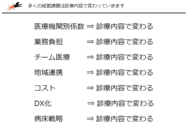 ただ、これらのテーマはすべて「診療内容で変わる」という共通点があります(以下図表)。つまり、病院が変わるかどうかは、「医師の行動が変わるかで決まる」ということに収斂されます。このことを念頭に置くと、「医師の行動を変えるにはどうすればいいのか」が病院経営において最大の課題であり、このための改善活動が重要になります。その改善活動として当社が推奨するのが、「診療科ヒアリング」となります。