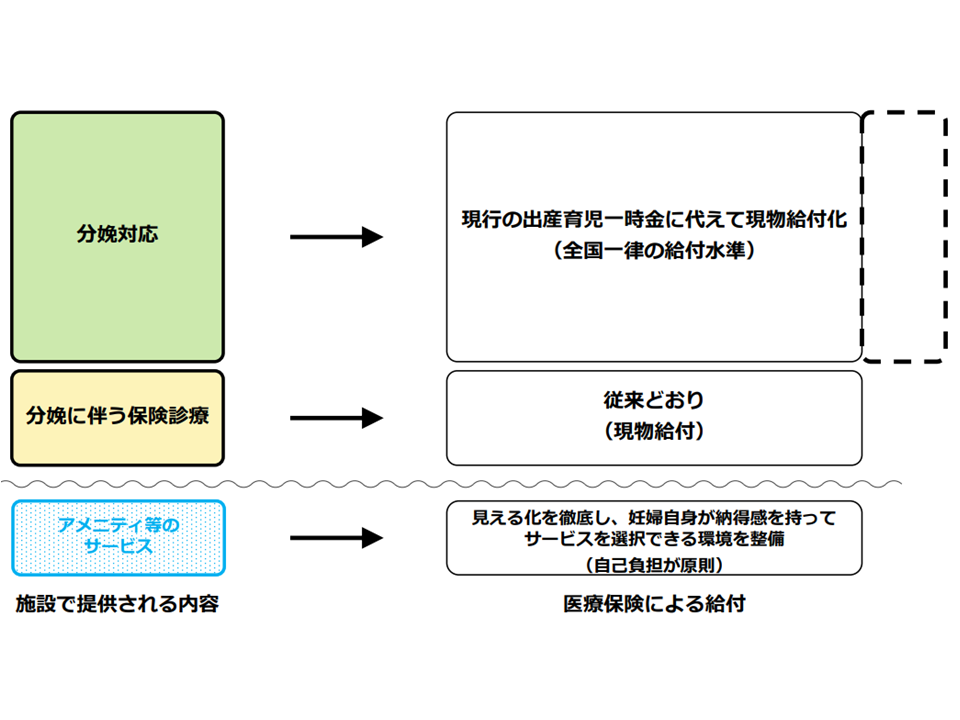 「標準的な出産費用」については「現物給付」を行い、患者の自己負担を無償化してはどうか。産科医療機関は医療保険から「基本単価×分娩件数」を収益として得ることとし、基本単価は「産科医療機関の経営が担保される」程度の十分な水準を確保してはどうか。ただしアメニティ部分などは「現物の給付」の中には含めない。また、こうした仕組み全国津々浦々に浸透させるには一定の時間がかかるため、例えば期限を定めて「当面、現物給付と、現在の出産育児一時金とを併存させる」ことを検討してはどうか―。