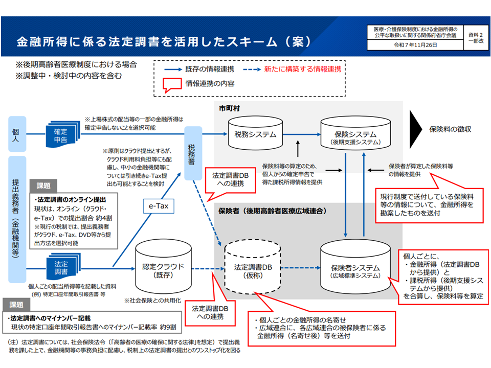 これを受けて関係省庁会議が開かれ、次期通常国会(2026年の通常国会)に「高齢者の医療の確保に関する法律」等の改正案を提出し、「金融所得を勘案した保険料設定」などに向けた準備を進めてはどうか、という議論が行われています。