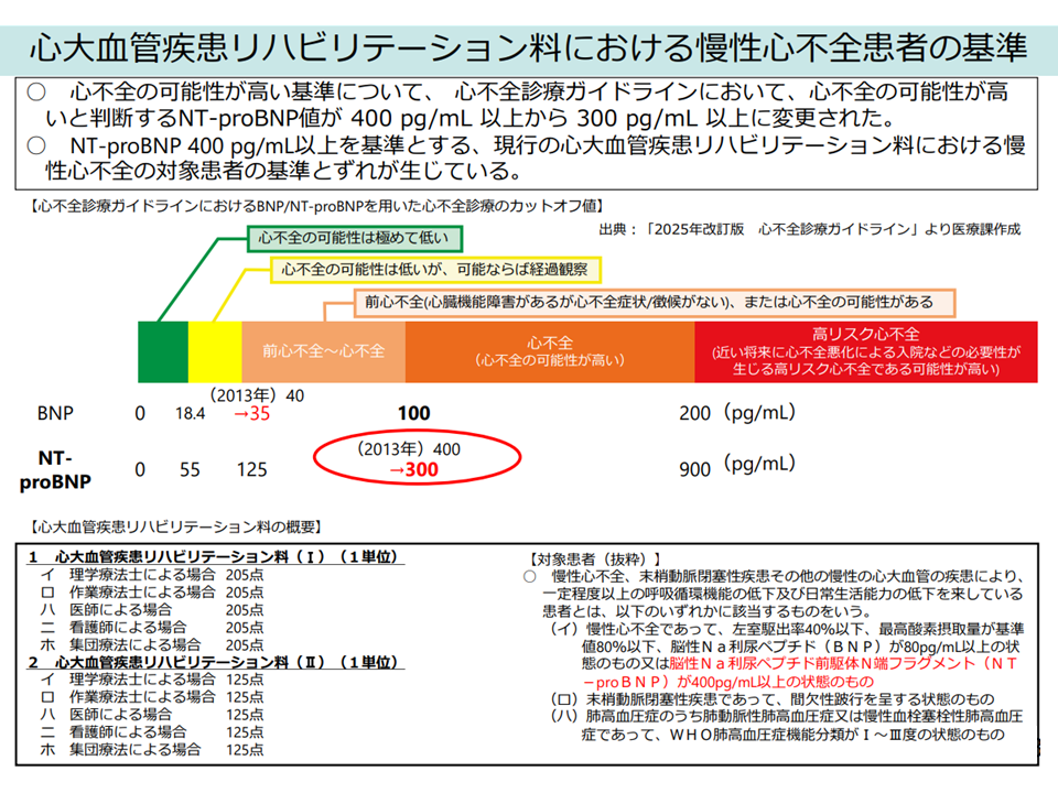 ▽心不全の生化学的診断基準の変化(NT-proBNP値が 「400pg/mL以上」から「300pg/mL以上」に変更)を踏まえ、心大血管疾患リハビリテーション料における慢性心不全の対象患者に係る基準を変更してはどうか