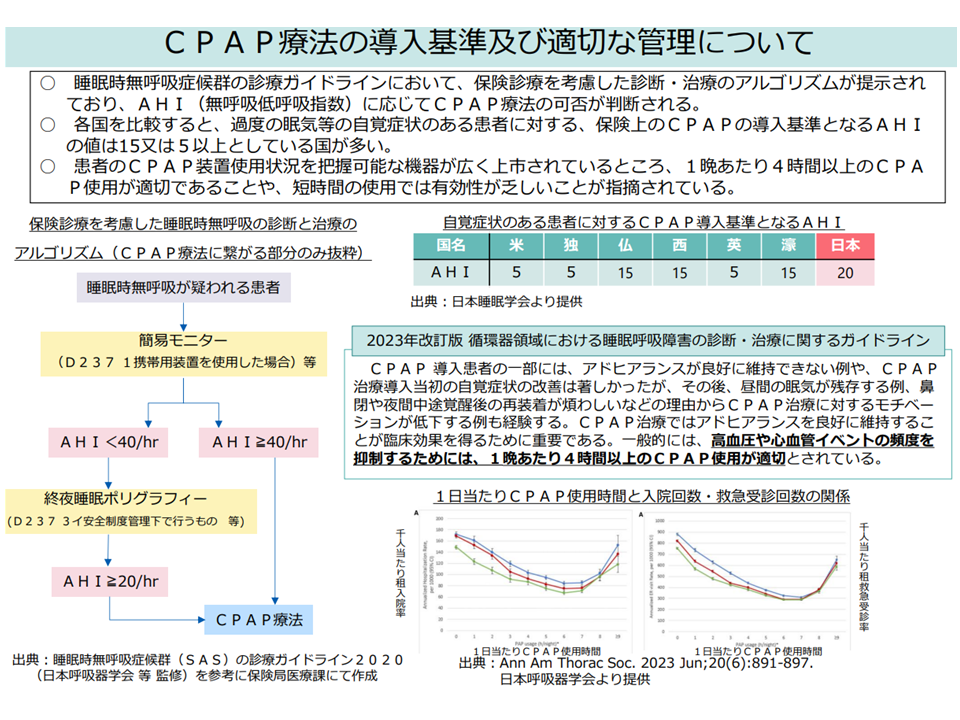 ・【在宅持続陽圧呼吸療法指導管理料】について、国際基準に沿って対象患者を広げるのであれば、同じく国際基準に沿って「4時間以上(推奨)の実施」をしない場合の減算などを行うべき。また【終夜睡眠ポリグラフィー】については、在宅では家族が機器操作などを行う点を踏まえた「適正化」(点数引き下げ)を検討すべき(支払側の松本委員)