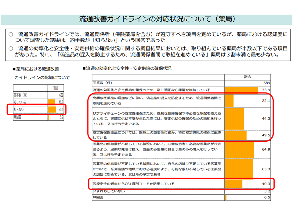 厚労省の調べでは、薬局における流通改善ガイドライン等への対応は必ずしも十分ではなく、「ガイドライン等に沿った取り組みに応じて、加算点数に軽重をつける」ことなどが考えられるかもしれません。