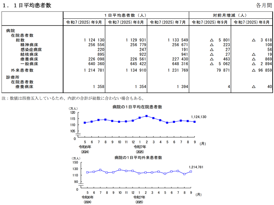 今年(2025年)9月末における(1)「1日平均患者数」は、病院全体で▼入院:112万4130人▼外来:121万4781人—となりました。
