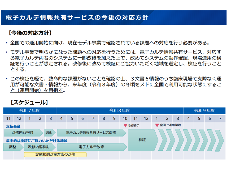 →国が本年度(2025年度)中に「標準化された電子カルテ」本格運用の具体的内容を示し、来年度(2026年度)中を目途に完成を目指す。本格運用の具体的内容を示すことを含め、必要な支援策の具体化を検討し、普及を促進する