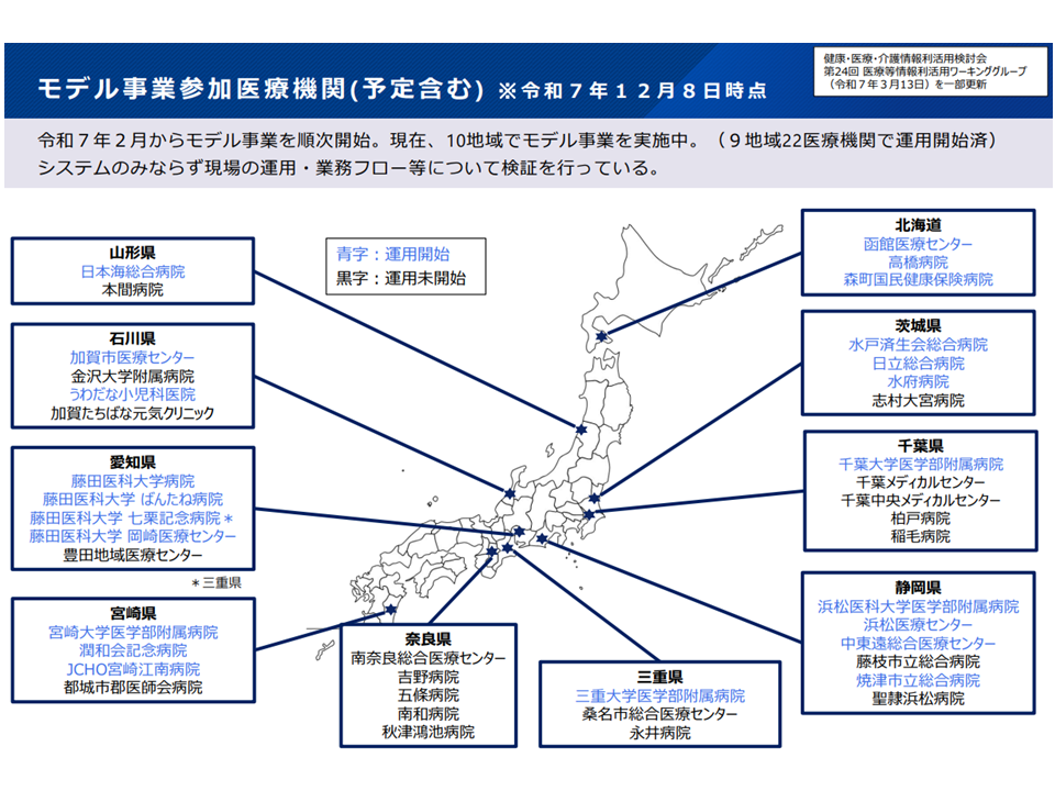 電子カルテ情報共有サービスのモデル事業実施状況(青字の医療機関が参加)(医療等情報利活用ワーキング1 251210)