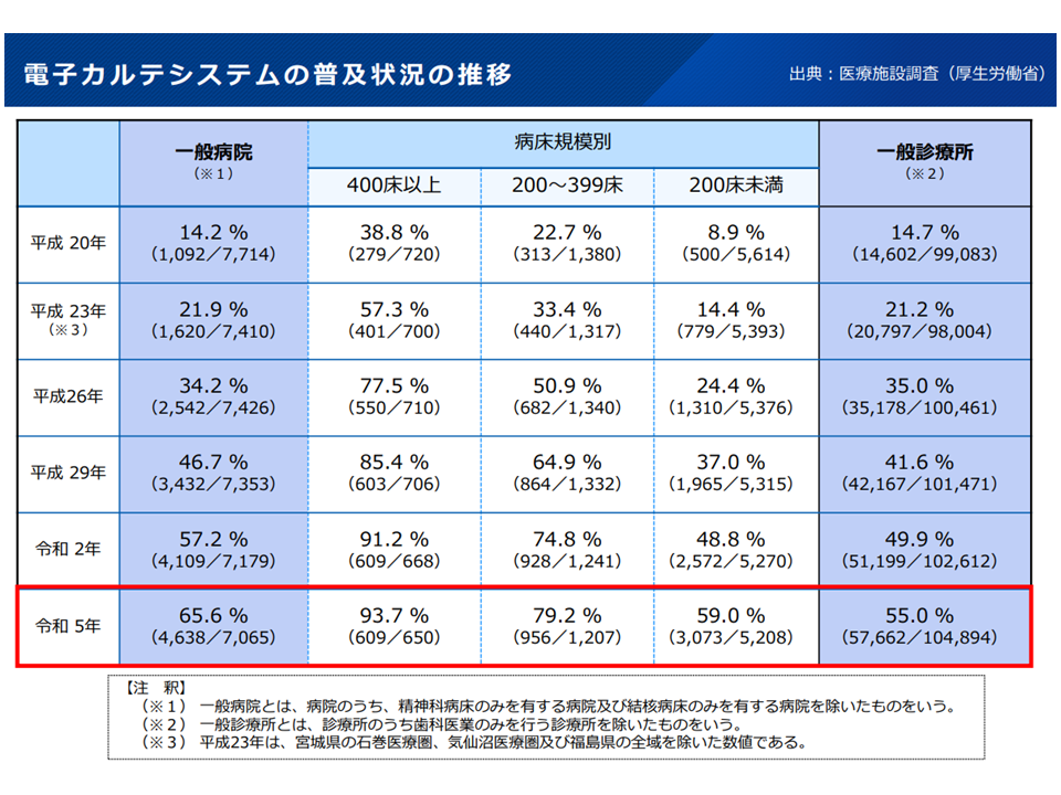 「より濃密な電子カルテ情報を、全国の医療機関間で共有する」ことに期待が集まりますが、電子カルテの導入状況を見ると、2023年時点では一般病院65.6%(400床以上:93.7%、200-399床:79.2%、200床未満:59.0%)、一般診療所55.0%となっています。「さらなる電子カルテの導入」促進に注力することが必要な状況です。