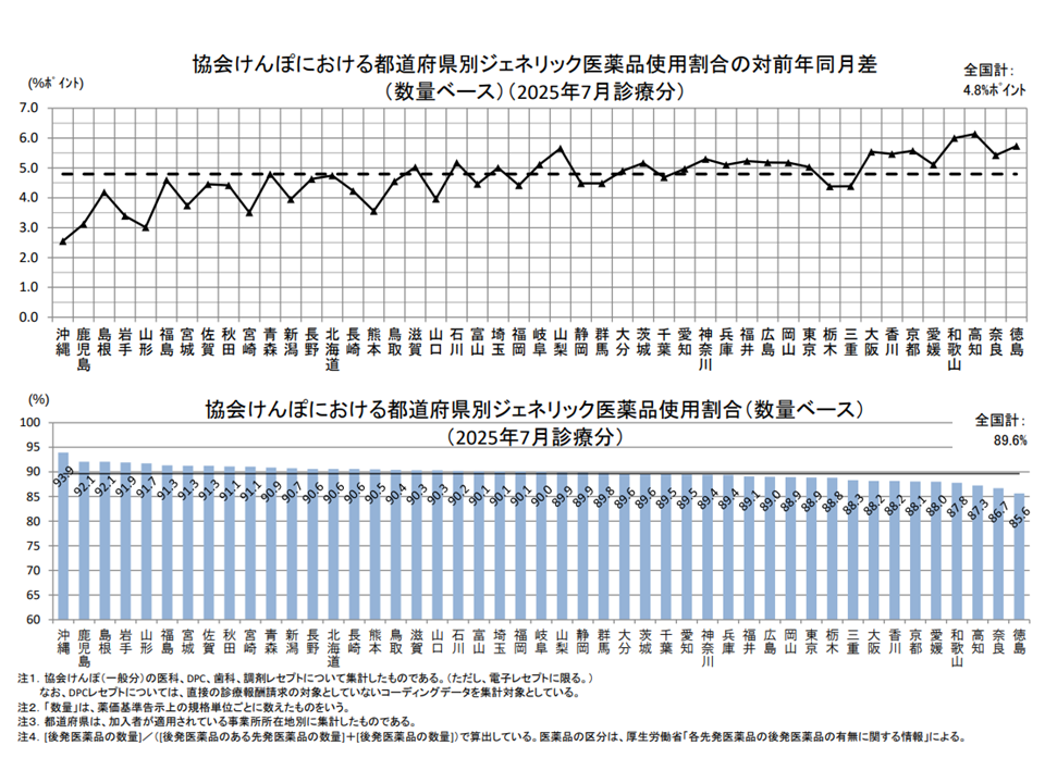 協会けんぽ全体の後発品割合、2025年7月にDPC等含めて89.6%・調剤分だけでは91.7%のままで、再び「踊り場」に入ってしまう