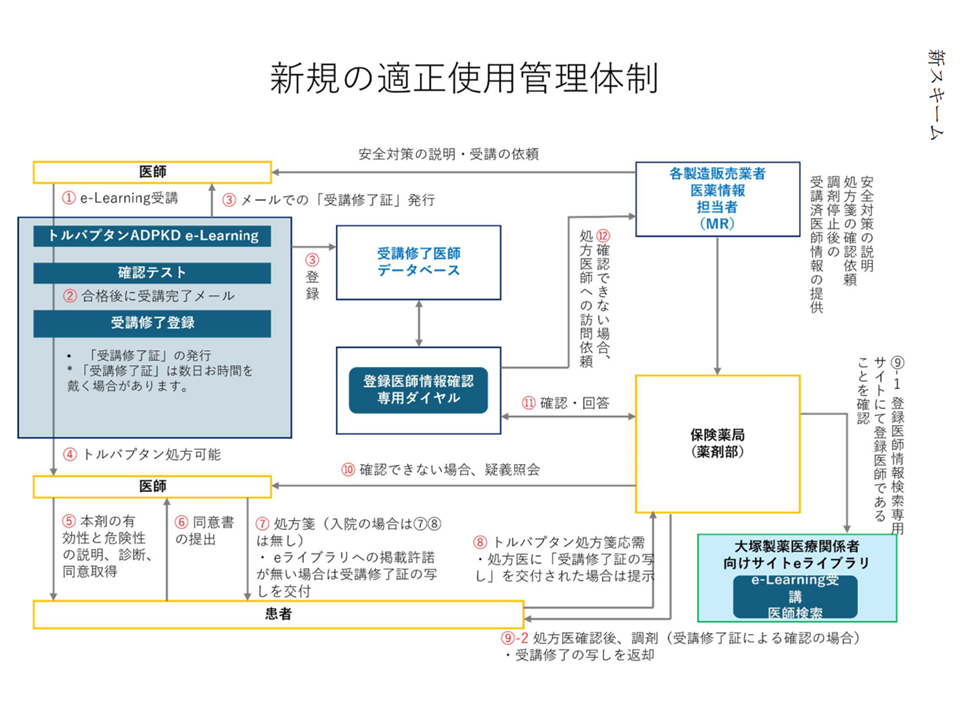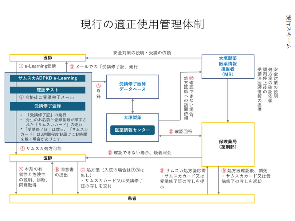 (2)外来患者にトルバプタン製剤を本効能・効果で処方する場合には、原則として、医師は処方箋のみを交付するが、必要に応じて、患者に対して「(1)の講習を修了した」旨を記載した受講修了証を交付する。なお新スキーム移行までは、従来通りサムスカカードを交付する