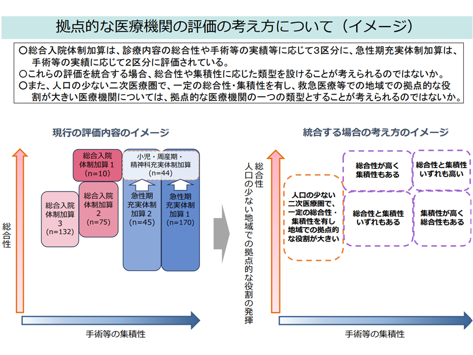 【総合入院体制加算】と【急性期充実体制加算】を再編・統合して「拠点的な急性期病院」を評価してはどうか。その際、人口の少ない地域では「絶対数の基準」クリアが難しい点への配慮も行ってはどうか―。