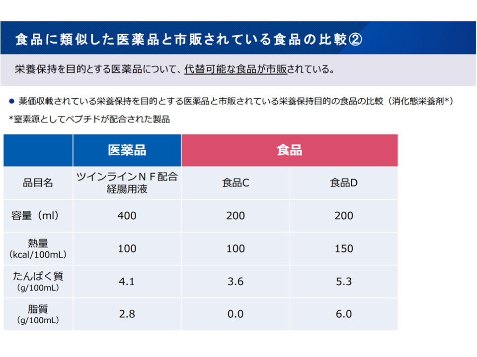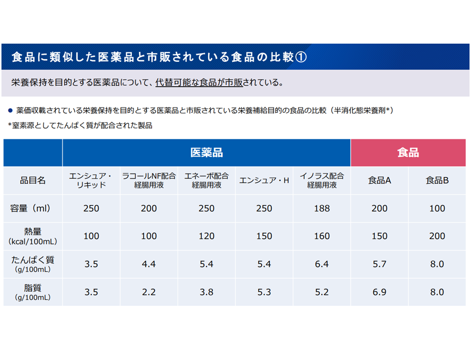 ▽栄養保持を目的とする医薬品について「同程度の栄養を有する食品が市販されている」点を踏まえて、給付の適正化(例えば「手術後患者の栄養保持」や「経口的食事摂取が困難な場合の経管栄養補給」など医師が特に栄養補給が必要であると判断する場合を除き、保険適用から除外することなど)を検討していく