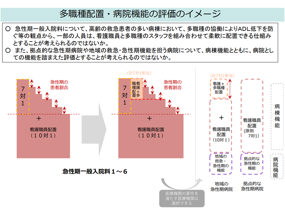 他方(a)は、現在「看護職員配置●対1、リハビリ専門職●名、管理栄養士●名」などと職種ごとに設定されている人員配置に関する施設基準について、例えば「看護職員、リハビリ専門職、管理栄養士などが患者●名に対し1名以上配置されていること」という基準も一定程度選択可能としてはどうか、というイメージです(ただし高齢救急患者が多い急性期一般病棟)。