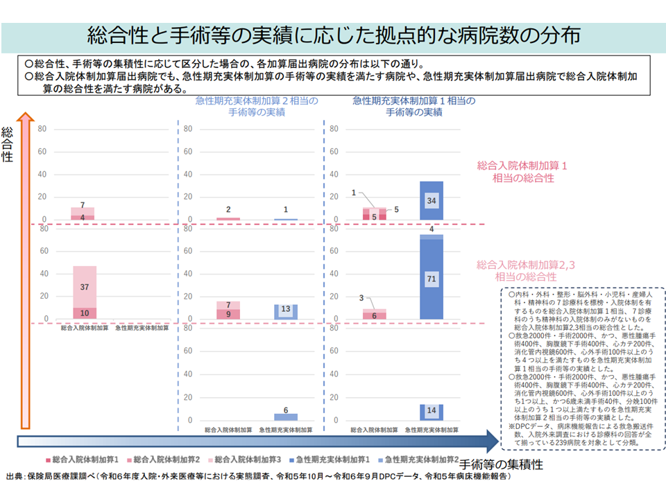 また急性期一般1病棟(7対1病棟)を持ち、「病院における救急搬送受け入れ件数・全身麻酔実施件数が多い」病院については、「拠点的な急性期病院」として評価し、機能発揮を求めて評価を行ってはどうか―。