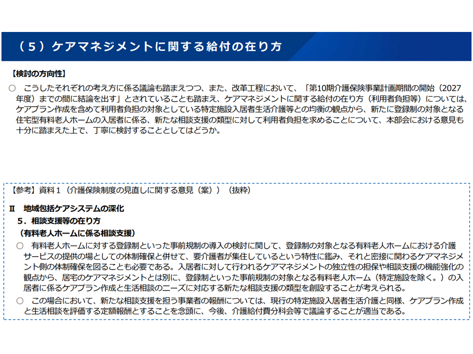 この提案に対しては、問題視されている「有料老人ホーム入居の条件としてホーム指定のケアマネ事業所・介護サービス提供事業者を利用する」(いわゆる囲い込み)ことを是認するものではないか、との指摘が江澤和彦委員(日本医師会常任理事)や石田路子委員(高齢社会をよくする女性の会副理事長/名古屋学芸大学看護学部客員教授)から出ているほか、「サービス利用控えにつながるため、そもそもケアマネジメントにかかる利用者負担は好ましくない」との声も平山春樹委員(日本労働組合総連合会総合政策推進局生活福祉局局長)や染川朗委員(UAゼンセン日本介護クラフトユニオン会長)らから出ています。
