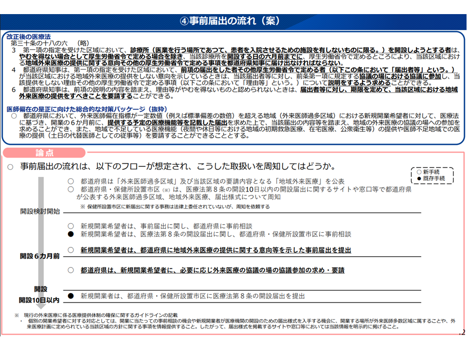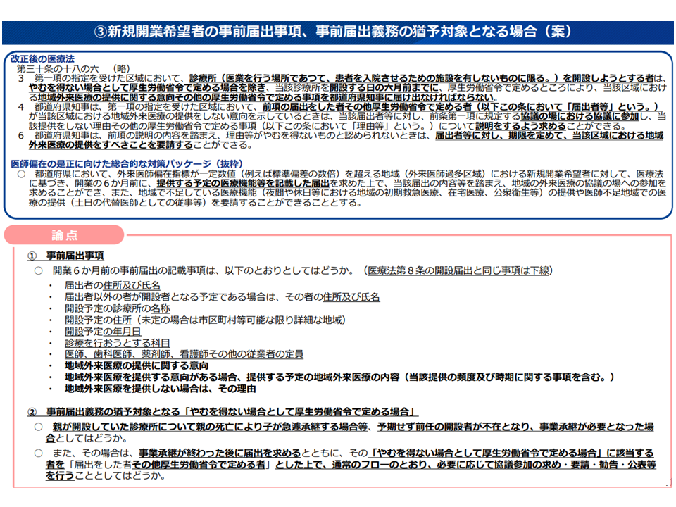 ▽都道府県から、外来医師が極めて多い地域(外来医師過多区域、例えば外来医師偏在指標が標準偏差の数倍超の地域)などで新規にクリニックを開業する者に対し、医療法に基づき「開業6か月前」に、提供する予定の医療機能等の届け出を求めた上で、当該届け出内容等を踏まえて、▼地域の「外来医療の協議の場」への参加を求める▼「地域で不足している医療機能」(夜間・休日等の初期救急、在宅医療、公衆衛生等)の提供や「医師不足地域での医療提供」(土日の代替医師としての従事等)を要請する—ことを可能とする