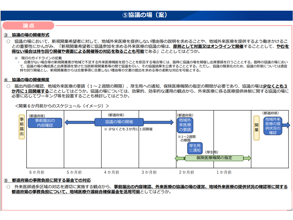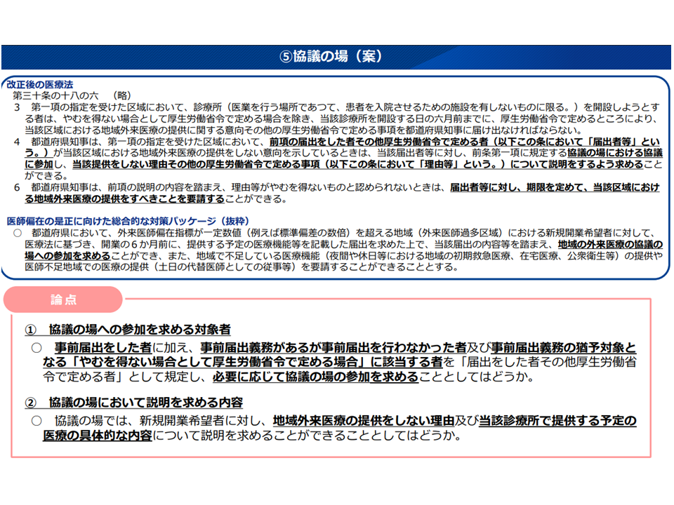 ▽協議の場では、新規開業希望者に対し「地域外来医療の提供をしない理由」「当該診療所で提供する予定の医療の具体的な内容」の説明を求めることを可能とする