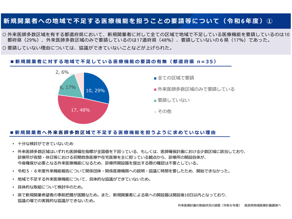 既に現在でも「外来医師が多い地域(外来偏在指標が上位3分の1の地域)での新規開業にあたっては、地域で不足する機能を要請する」仕組みが存在しますが、こうした要請を行っていない都道府県も6地域存在するなど実効性が疑問視されていました。