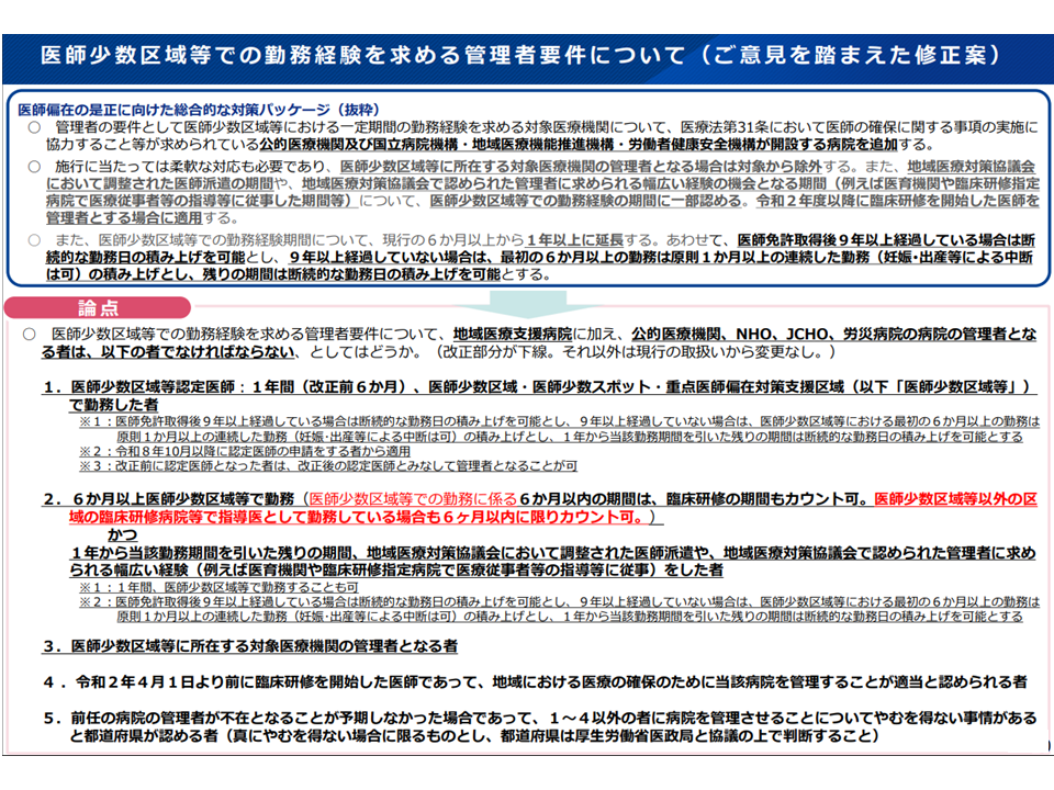 →「医師少数区域等に所在する医療機関の管理者となる場合は対象から除外する」、「地域医療対策協議会で調整された医師派遣の期間、地域医療対策協議会で認められた管理者に求められる幅広い経験の機会となる期間(例えば大学病院等の医育機関で医療従事者等の指導等に従事した期間等)の一部を勤務経験期間として認める」などの緩和措置を設ける