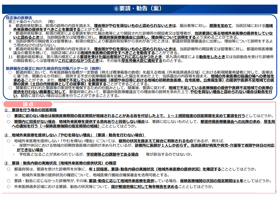 ▽要請にも関わらず「地域で不足している医療機能提供」「医師不足地域での医療提供」を行わない開業者に対し、都道府県医療審議会での理由等説明を求めた上で、やむを得ない理由がない場合には都道府県が「勧告」「公表」を行うことを可能とする