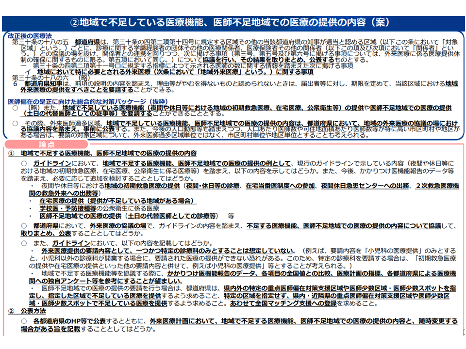 ・医師不足地域での医療提供を要請する場合は、都道府県は「県内外の特定の重点医師偏在対策支援区域や医師少数区域・医師少数スポットを指定し、指定した区域で不足している医療を提供する」よう求める、「特定の区域を指定せず、県内・近隣県の重点医師偏在対策支援区域や医師少数区域・医師少数スポットで不足している医療を提供する」よう求める。あわせて全国マッチング支援への登録を求める